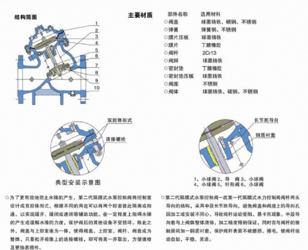 JD745X多功能水泵控制閩是安裝在大口徑給水管網(wǎng)系統(tǒng)的水泵出口處,防止介質(zhì)倒流水錘及水擊現(xiàn)象的智能型閥門。該閥兼具電動閥、逆止閥和水錘消除器三種功能,可有效地提高用于生活小區(qū)中消防用水與生活用水并聯(lián)的供水系統(tǒng)的安全可靠性。雙腔室結(jié)構(gòu)可使間門在停泵后迅速關(guān)閉90%(防止回流介質(zhì)導(dǎo)致水泵反轉(zhuǎn)),再緩慢關(guān)閉其余10%(消除破壞性水錘)。該悶門性能可靠、強度高、動作平穩(wěn),適用于開泵水錘和停泵水錘的場合,只需操作水泵電機啟閉按鈕,閥門即可按照水泵操作規(guī)程自動實現(xiàn)啟閉,流程大、壓力損失小。
